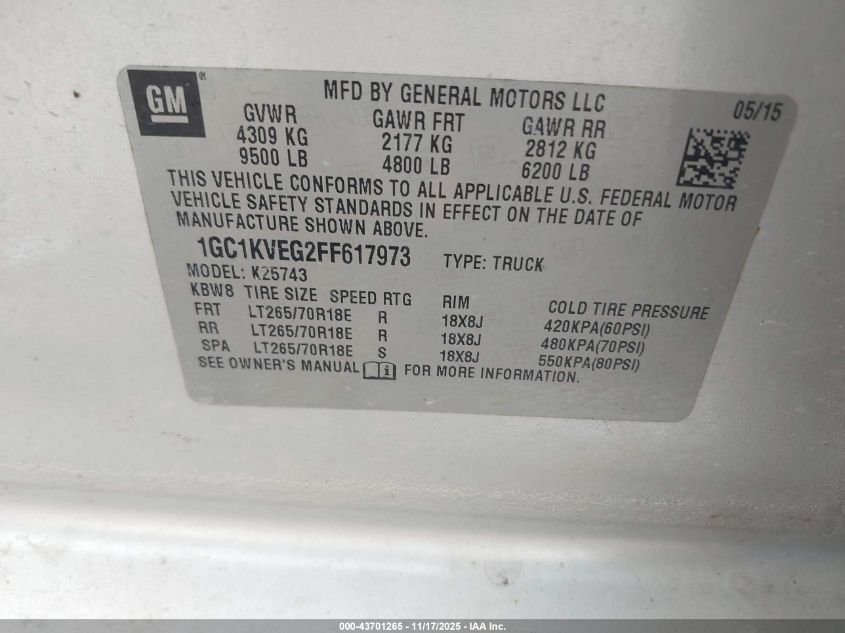 Колір СрібнийЦиліндри 8Привід Повний привідVIN 1GC1KVEG2FF617973Стан Заводиться та їде (перевірено)Ушкодження Передня або задняДата аукціону 2025-12-09