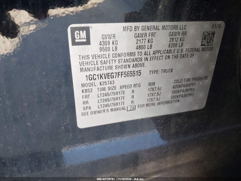 Колір ЧорнийЦиліндри 8Привід Повний привідVIN 1GC1KVEG7FF565515Стан СтаціонарноУшкодження Передня або задня