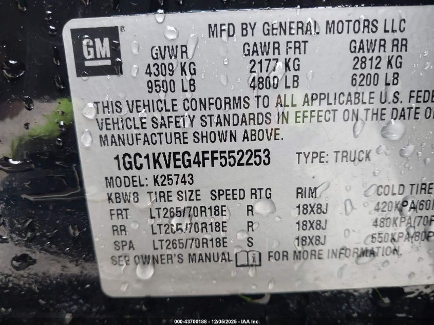 Колір ЧорнийЦиліндри 8Привід Повний привідVIN 1GC1KVEG4FF552253Стан Заводиться та їде (перевірено)Ушкодження Передня і задня Дата аукціону 2025-12-15