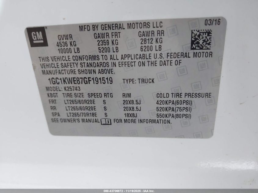 Колір БілийЦиліндри 8Привід Повний привідVIN 1GC1KWE87GF191519Стан Заводиться та їде (перевірено)Ушкодження Передня або задня