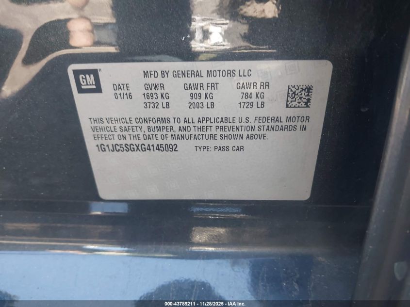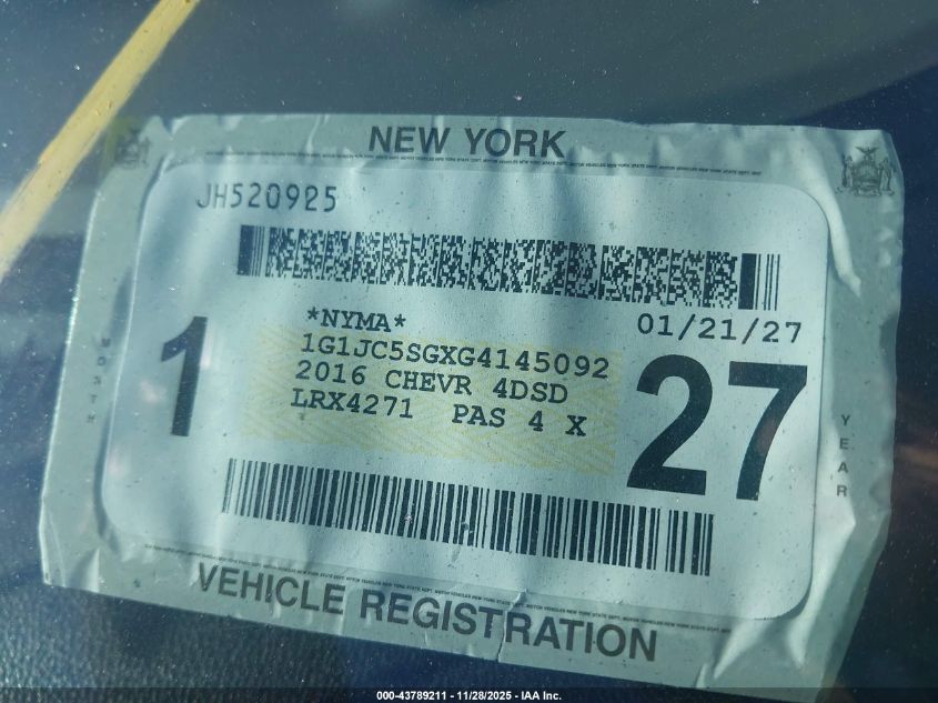 2016 CHEVROLET SONIC 2016 року Бензин, 1.8, Передній привід, vin - 1G1JC5SGXG4145092 з США