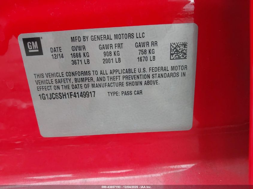 2015 CHEVROLET SONIC 2015 року Бензин, 1.8, Передній привід, vin - 1G1JC6SH1F4149917 з США