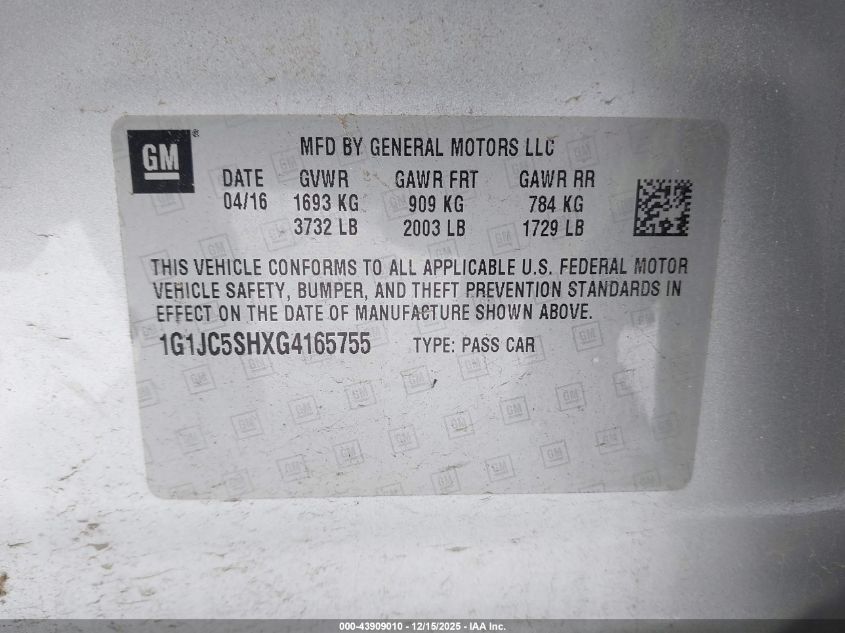 2016 CHEVROLET SONIC 2016 року Бензин, 1.8, Передній привід, vin - 1G1JC5SHXG4165755 з США