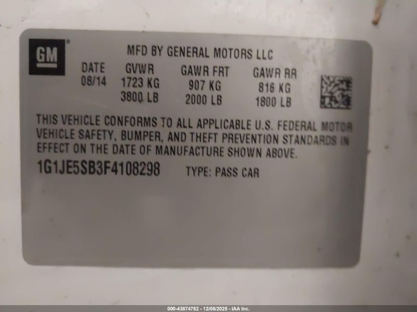 2015 CHEVROLET SONIC 2015 року Бензин, 1.4, Передній привід, vin - 1G1JE5SB3F4108298 з США