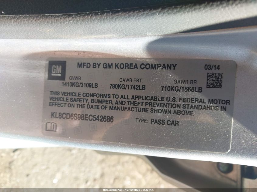 2014 CHEVROLET SPARK 2014 року Бензин, 1.2, Передній привід, vin - KL8CD6S98EC542686 з США