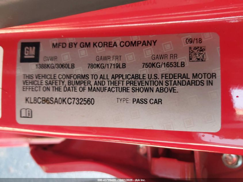 2019 CHEVROLET SPARK 2019 року Бензин, 1.4, Передній привід, vin - KL8CB6SA0KC732560 з США