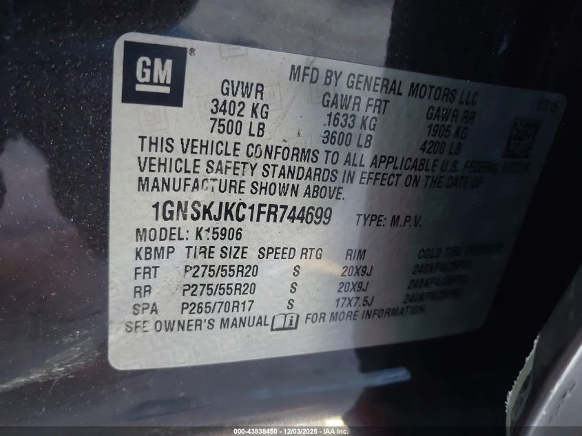 2015 CHEVROLET SUBURBAN 2015 року Бензин, 5.3, Повний привід, vin - 1GNSKJKC1FR744699 з США