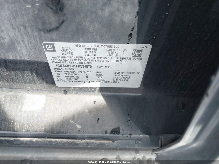 2015 CHEVROLET SUBURBAN 2015 року Бензин, 5.3, Повний привід, vin - 1GNSKKKC1FR524579 з США