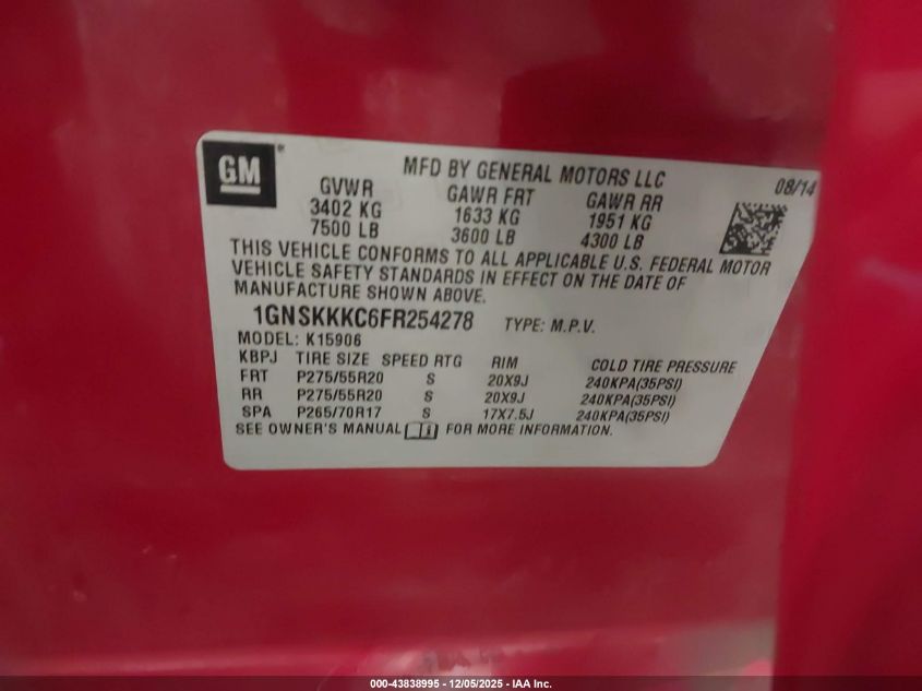 2015 CHEVROLET SUBURBAN 2015 року Бензин, 5.3, Повний привід, vin - 1GNSKKKC6FR254278 з США
