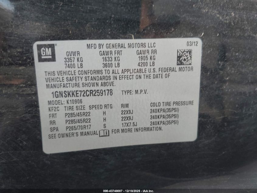 2012 CHEVROLET SUBURBAN 2012 року Бензин, 5.3, Повний привід, vin - 1GNSKKE72CR259178 з США
