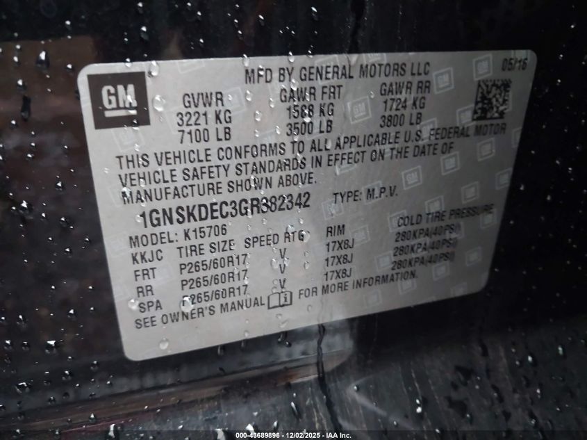 2016 CHEVROLET TAHOE 2016 року Бензин, 5.3, Повний привід, vin - 1GNSKDEC3GR382342 з США