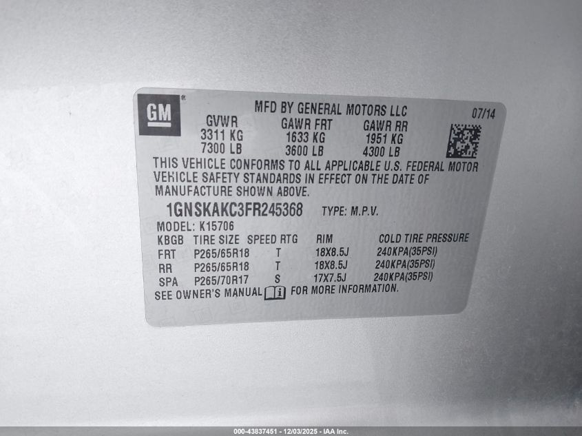 2015 CHEVROLET TAHOE 2015 року Бензин, 5.3, Повний привід, vin - 1GNSKAKC3FR245368 з США