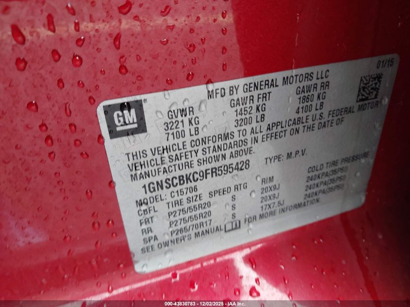 2015 CHEVROLET TAHOE 2015 року Бензин, 5.3, , vin - 1GNSCBKC9FR595428 з США