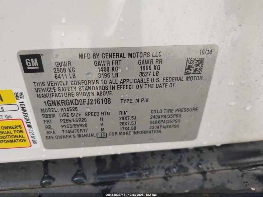 2015 CHEVROLET TRAVERSE 2015 року Бензин, 3.6, Передній привід, vin - 1GNKRGKD0FJ216108 з США
