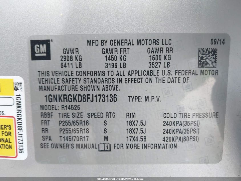 2015 CHEVROLET TRAVERSE 2015 року Бензин, 3.6, Передній привід, vin - 1GNKRGKD8FJ173136 з США
