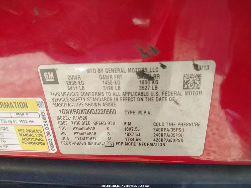 Колір БордовийЦиліндри 6Привід Передній привідVIN 1GNKRGKD9DJ220560Стан СтаціонарноУшкодження Передня або задня