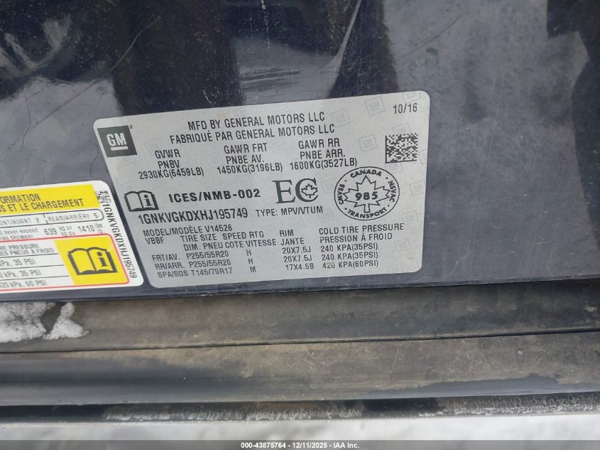2017 CHEVROLET TRAVERSE 2017 року Бензин, 3.6, Повний привід, vin - 1GNKVGKDXHJ195749 з США