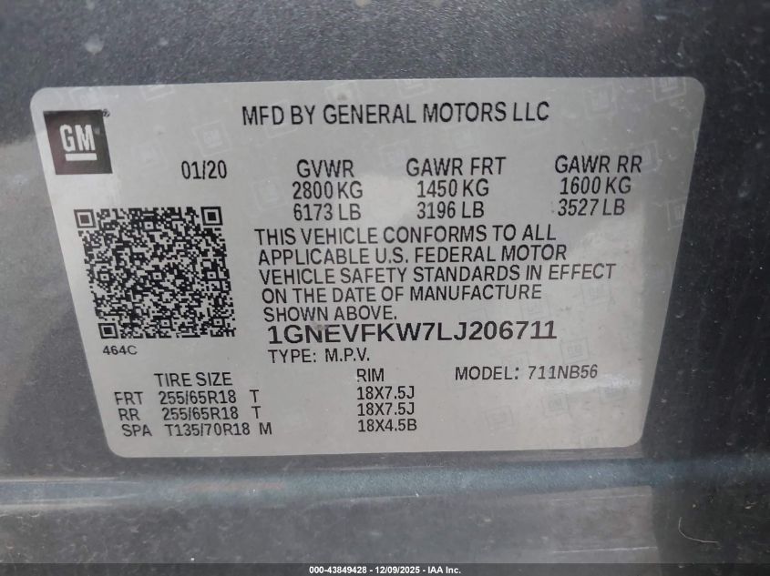 2020 CHEVROLET TRAVERSE 2020 року Бензин, 3.6, Повний привід, vin - 1GNEVFKW7LJ206711 з США
