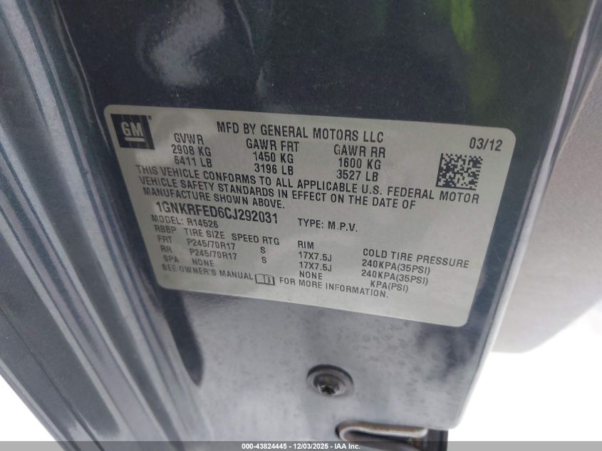 2012 CHEVROLET TRAVERSE 2012 року Бензин, 3.6, Передній привід, vin - 1GNKRFED6CJ292031 з США