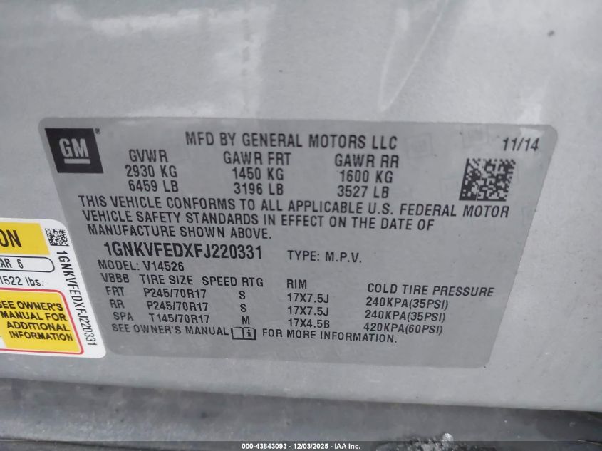 2015 CHEVROLET TRAVERSE 2015 року Бензин, 3.6, Повний привід, vin - 1GNKVFEDXFJ220331 з США