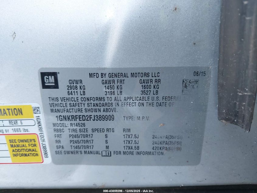 2015 CHEVROLET TRAVERSE 2015 року Бензин, 3.6, Передній привід, vin - 1GNKRFED2FJ389909 з США