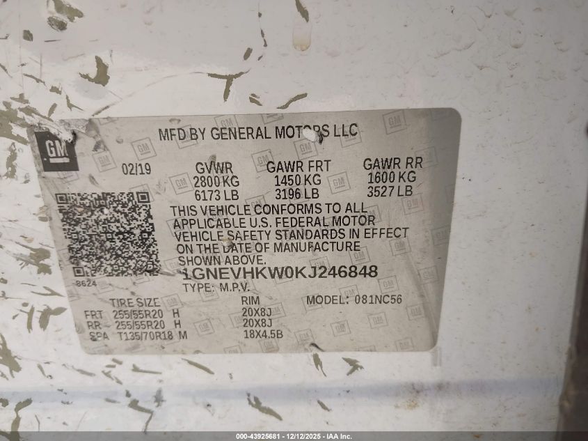 2019 CHEVROLET TRAVERSE 2019 року Бензин, 3.6, Повний привід, vin - 1GNEVHKW0KJ246848 з США
