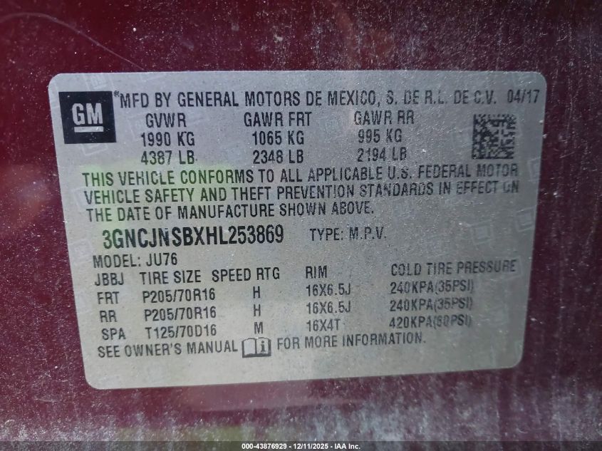 2017 CHEVROLET TRAX 2017 року Бензин, 1.4, Повний привід, vin - 3GNCJNSBXHL253869 з США