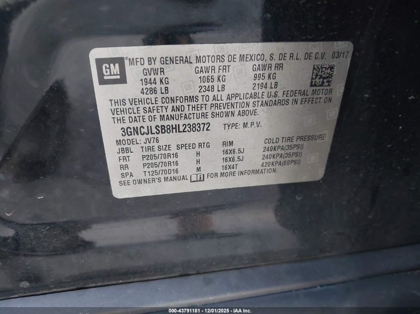 2017 CHEVROLET TRAX 2017 року Бензин, 1.4, Передній привід, vin - 3GNCJLSB8HL238372 з США