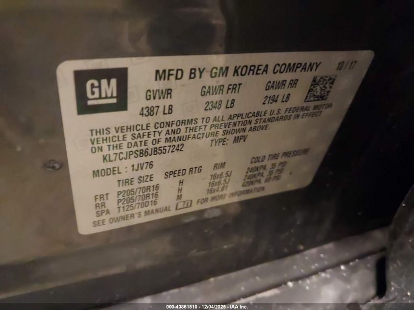 Колір СірийЦиліндри 4Привід Повний привідVIN KL7CJPSB6JB557242Стан Заводиться та їде (перевірено)Ушкодження Передня ліва AutoRIA