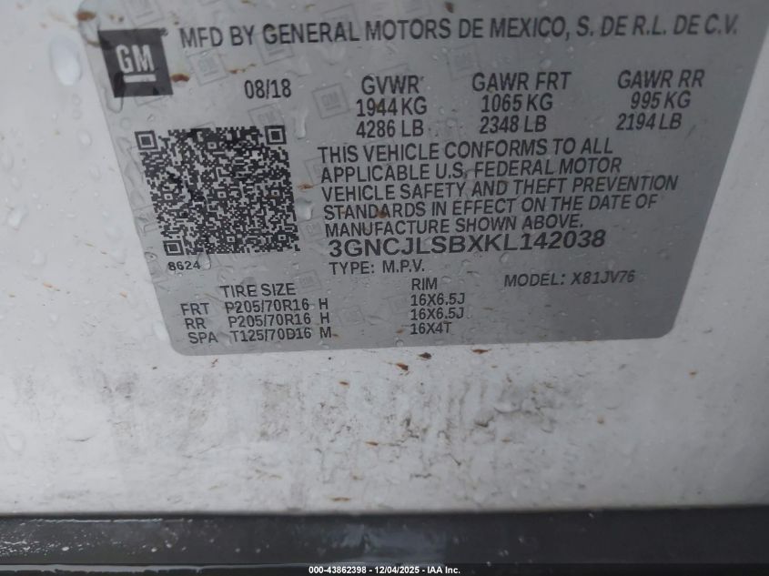 2019 CHEVROLET TRAX 2019 року Бензин, 1.4, Передній привід, vin - 3GNCJLSBXKL142038 з США
