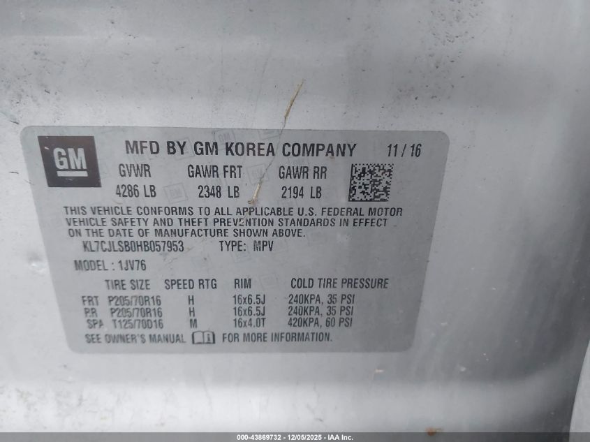 2017 CHEVROLET TRAX 2017 року Бензин, 1.4, Передній привід, vin - KL7CJLSB0HB057953 з США