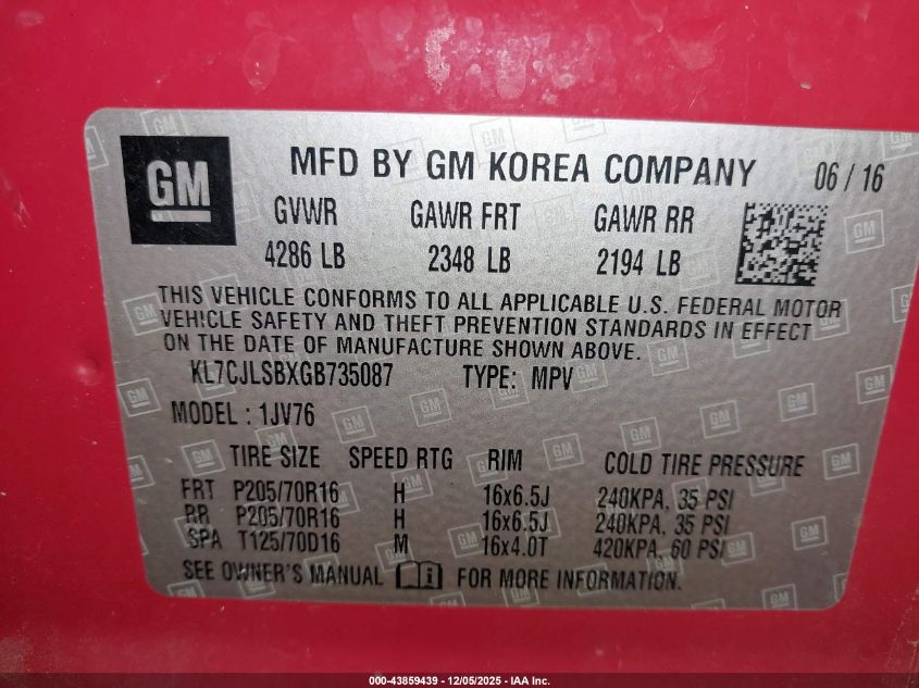 2016 CHEVROLET TRAX 2016 року Бензин, 1.4, Передній привід, vin - KL7CJLSBXGB735087 з США