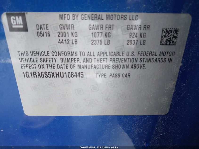 2017 CHEVROLET VOLT 2017 року Гібрид, 1.5, Передній привід, vin - 1G1RA6S5XHU108445 з США