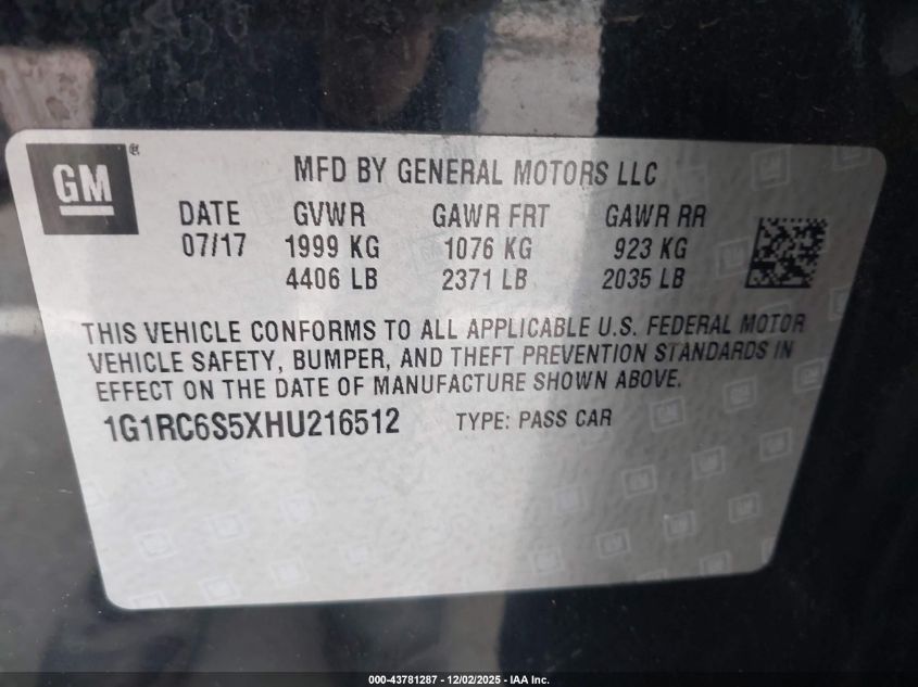 2017 CHEVROLET VOLT 2017 року Гібрид, 1.5, Передній привід, vin - 1G1RC6S5XHU216512 з США