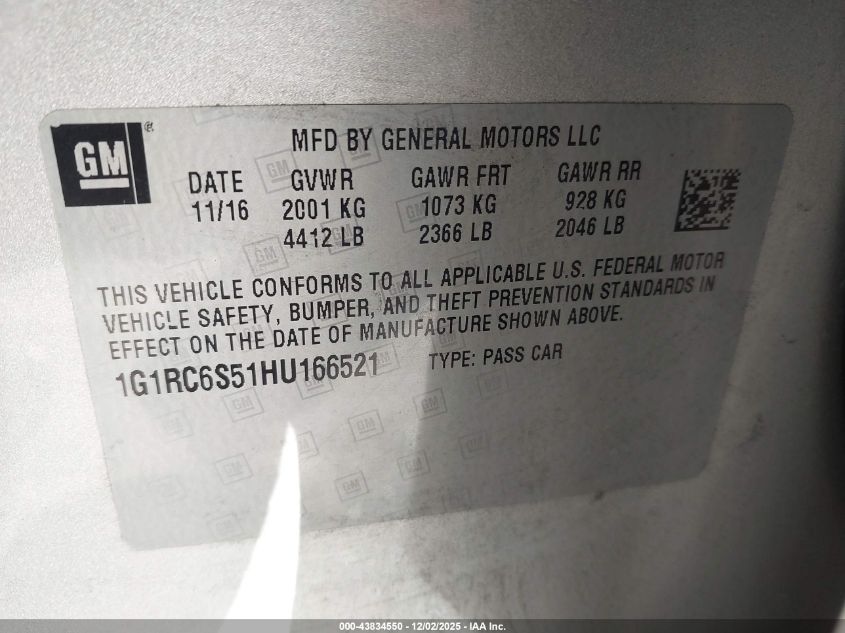 2017 CHEVROLET VOLT 2017 року Гібрид, 1.5, Передній привід, vin - 1G1RC6S51HU166521 з США