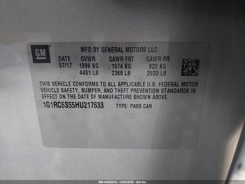 2017 CHEVROLET VOLT 2017 року Гібрид, 1.5, Передній привід, vin - 1G1RC6S55HU217633 з США