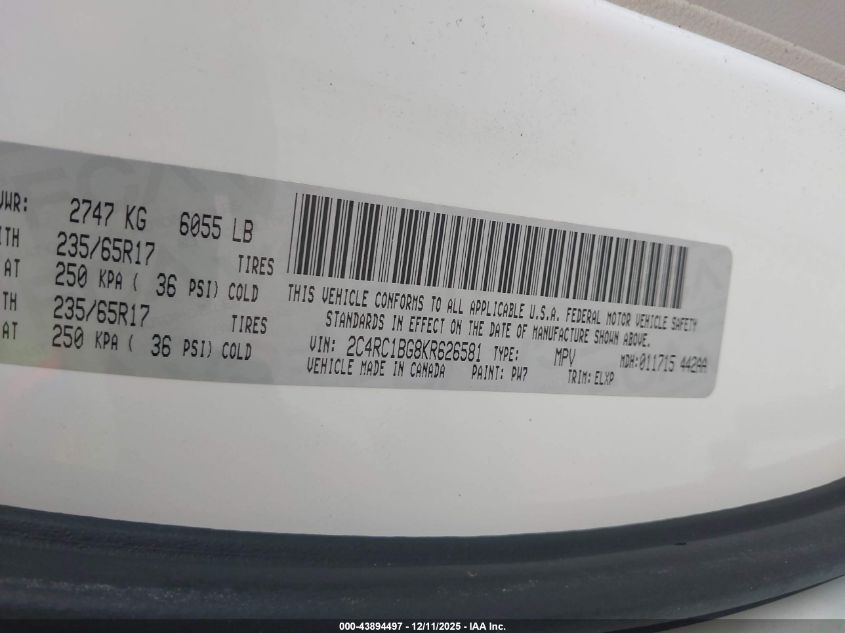 Колір БілийЦиліндри 6Привід Передній привідVIN 2C4RC1BG8KR626581Стан Заводиться та їде (перевірено)Ушкодження Передня або задня AutoRIA