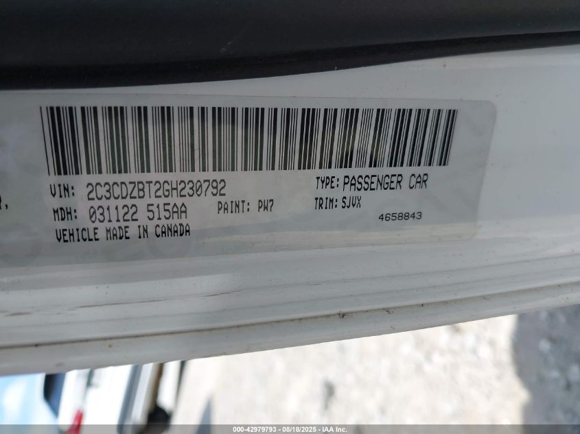 Колір БілийЦиліндри 8Привід Задній привідVIN 2C3CDZBT2GH230792Стан СтаціонарноУшкодження ПерекиданняДата аукціону 2025-12-15 AutoRIA