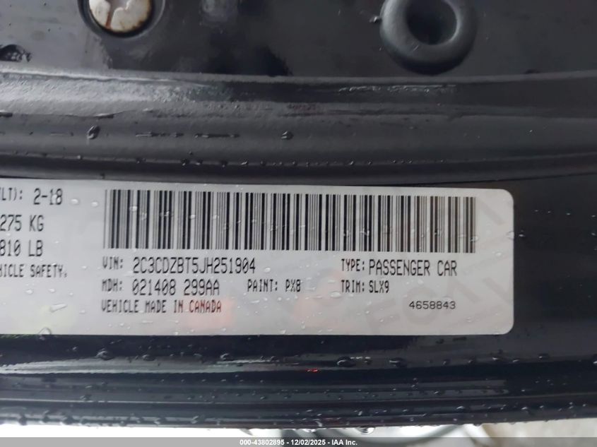 Колір ЧорнийЦиліндри 8Привід Задній привідVIN 2C3CDZBT5JH251904Стан Заводиться та їде (перевірено)Ушкодження Передня або задня AutoRIA