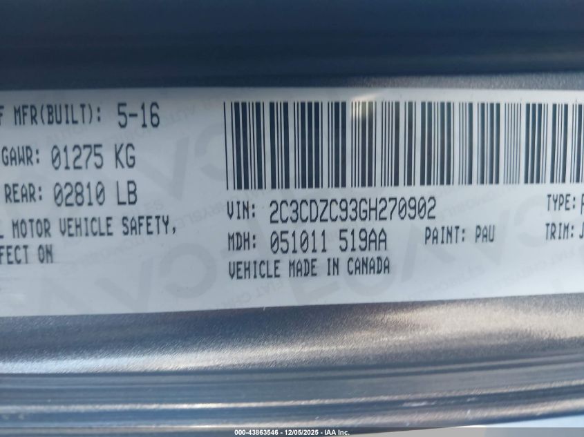 Колір СірийЦиліндри 8Привід Задній привідVIN 2C3CDZC93GH270902Стан СтаціонарноУшкодження Передня або задня AutoRIA