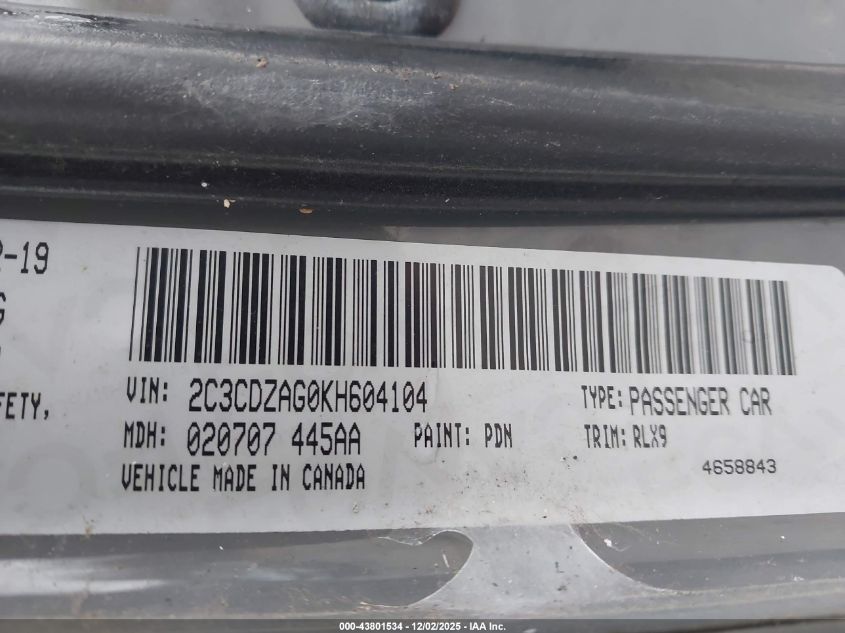 2019 DODGE CHALLENGER 2019 року Бензин, 3.6, Задній привід, vin - 2C3CDZAG0KH604104 з США