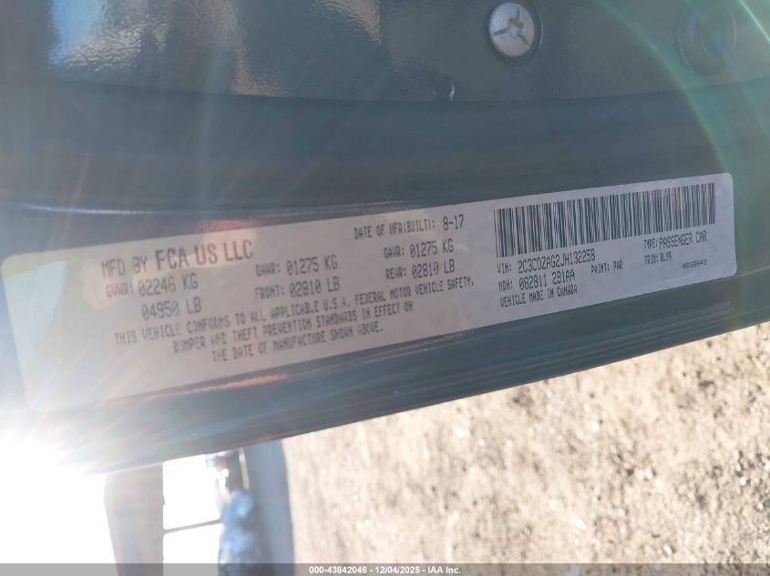 Колір СірийЦиліндри 6Привід Задній привідVIN 2C3CDZAG2JH132258Стан Заводиться та їде (перевірено)Ушкодження Передня або задня AutoRIA