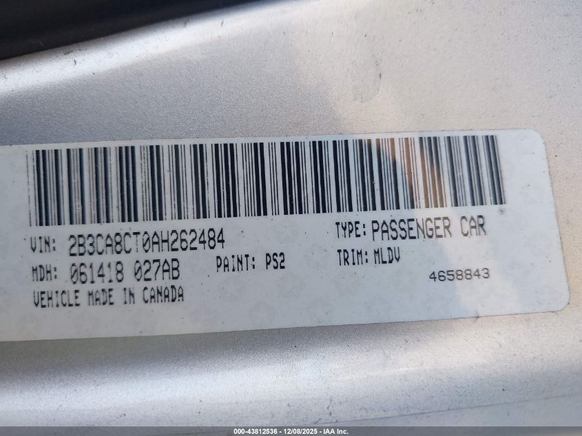 Колір СрібнийЦиліндри 8Привід Задній привідVIN 2B3CA8CT0AH262484Стан СтаціонарноУшкодження Передня або задня