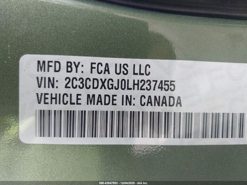 Колір ЗеленийЦиліндри 8Привід Задній привідVIN 2C3CDXGJ0LH237455Стан Заводиться та їде (перевірено)Ушкодження Передня права AutoRIA