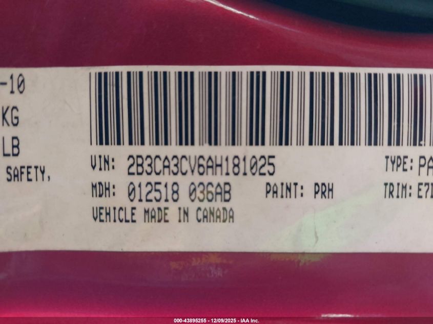 Колір ЧервонийЦиліндри 6Привід Задній привідVIN 2B3CA3CV6AH181025Стан СтаціонарноУшкодження Пожежа двигуна