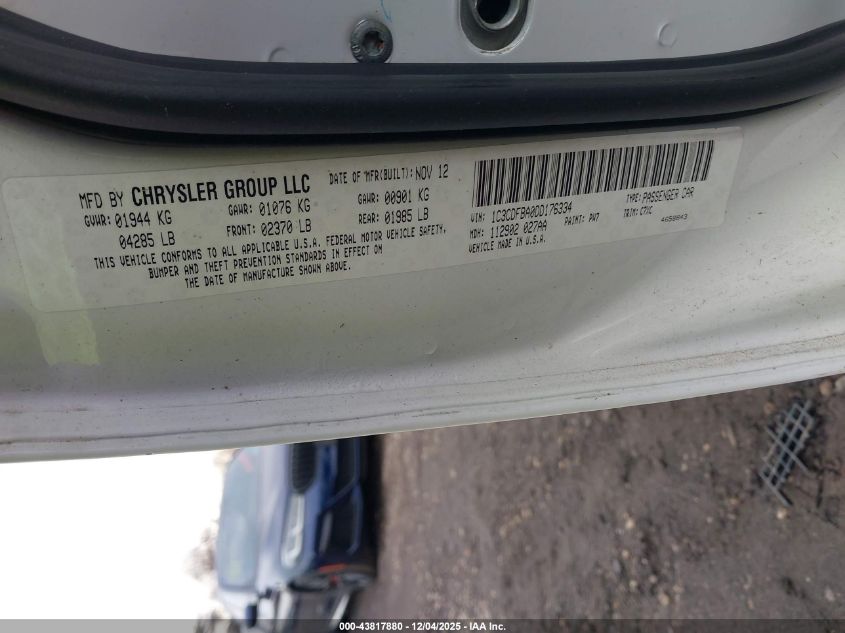 Колір БілийЦиліндри 4Привід Передній привідVIN 1C3CDFBA0DD176334Стан СтаціонарноУшкодження ЗадняДата аукціону 2025-12-09 AutoRIA