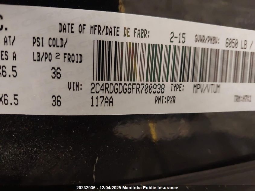 Колір ЧорнийЦиліндри 6Привід Передній привідVIN 2C4RDGDG6FR700938Стан СтаціонарноУшкодження ПередняДата аукціону 2025-12-10 AutoRIA