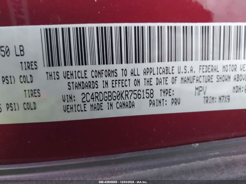 2019 DODGE GRAND CARAVAN 2019 року Бензин, 3.6, Передній привід, vin - 2C4RDGBG0KR756158 з США