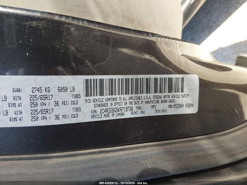 2019 DODGE GRAND CARAVAN 2019 року Бензин, 3.6, Передній привід, vin - 2C4RDGBG5KR719736 з США