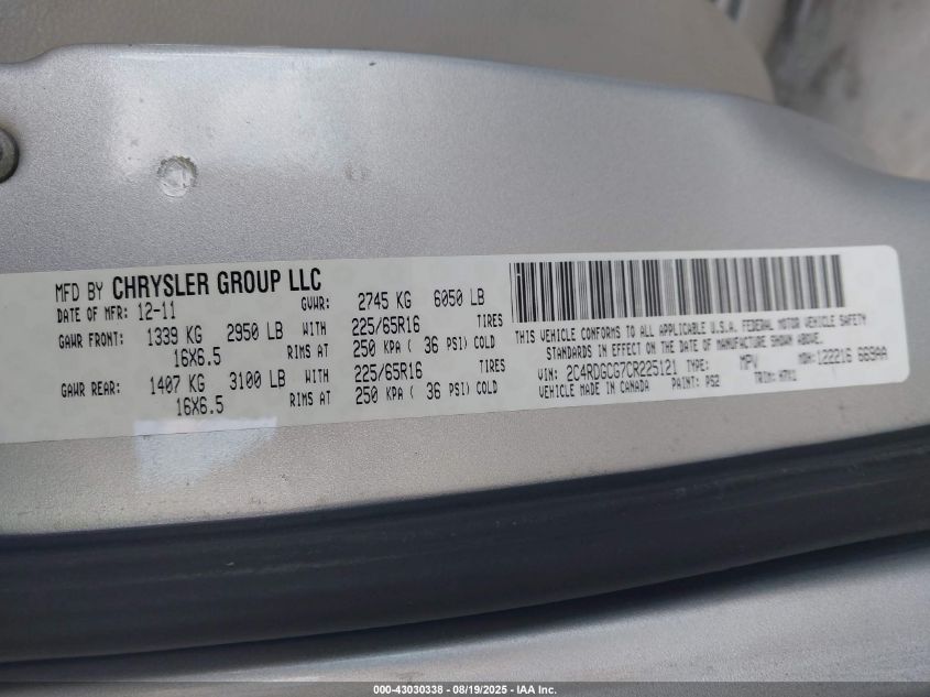 2012 DODGE GRAND CARAVAN 2012 року Бензин, 3.6, Передній привід, vin - 2C4RDGCG7CR225121 з США